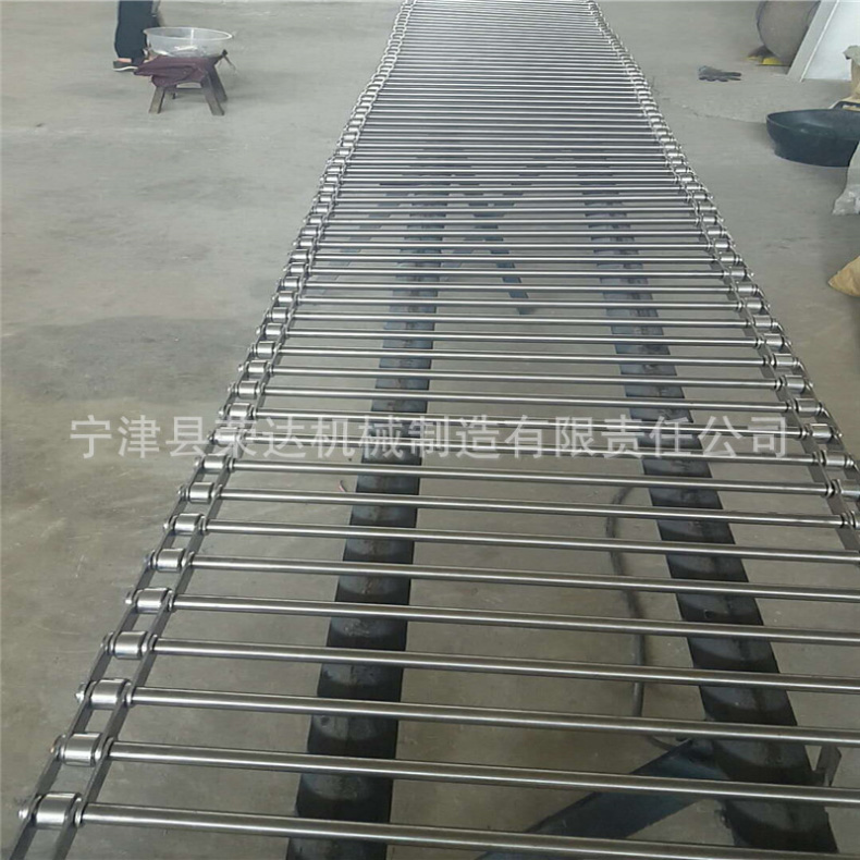 這是一種利用鏈條和支軸做成的傳送輸送帶。先把支軸穿軸的兩頭車細(xì),然后兩邊鑲上鏈條,最后用墊圈把支軸焊上或用開口銷銷上,這就是鏈桿式輸送帶。鏈條的節(jié)距和材質(zhì)和滾子的大小各種都有,支軸的粗細(xì)和材質(zhì)和直徑和長度有多種型號(hào)供選擇。