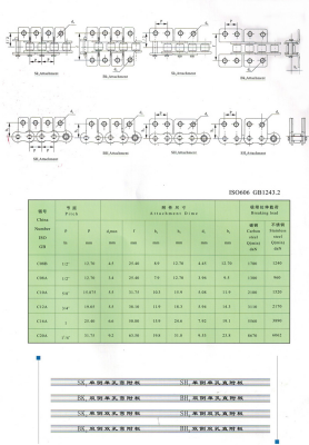 (2)現(xiàn)在靜音無聲齒形鏈條應(yīng)用越來越廣泛,高速無聲靜音低噪音鏈條齒輪應(yīng)用越來越普遍,有的人把原來的同步帶都換成這種無聲齒形鏈條,有的人使用滾子鏈條噪音太大,也在改成無聲齒形鏈條齒輪。有的高精密要求傳送傳遞精度高的輸送線也在采用無聲齒形鏈條齒輪,好多鍛造行業(yè)快速的傳送鍛造件也在采用無聲齒形鏈條,在輸送線上有好多需要平穩(wěn)輸送的也在采用無聲齒形鏈條作為輸送帶來輸送物件。目前齒形鏈條有一秒16米到30米,無聲齒形鏈條有單軸的,有雙軸的,節(jié)距有9.525毫米的型號(hào)CL06 SC3,12.7毫米的CL08 SC4 C4,15.875毫米的無聲齒形鏈條CL10,SC5 ,19.05毫米的CL12 SC6 ,25.4毫米的CL16,SC6;31.75毫米齒形鏈條CL20 SC10 ,無聲齒形鏈條38.1毫米CL24 .