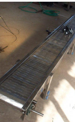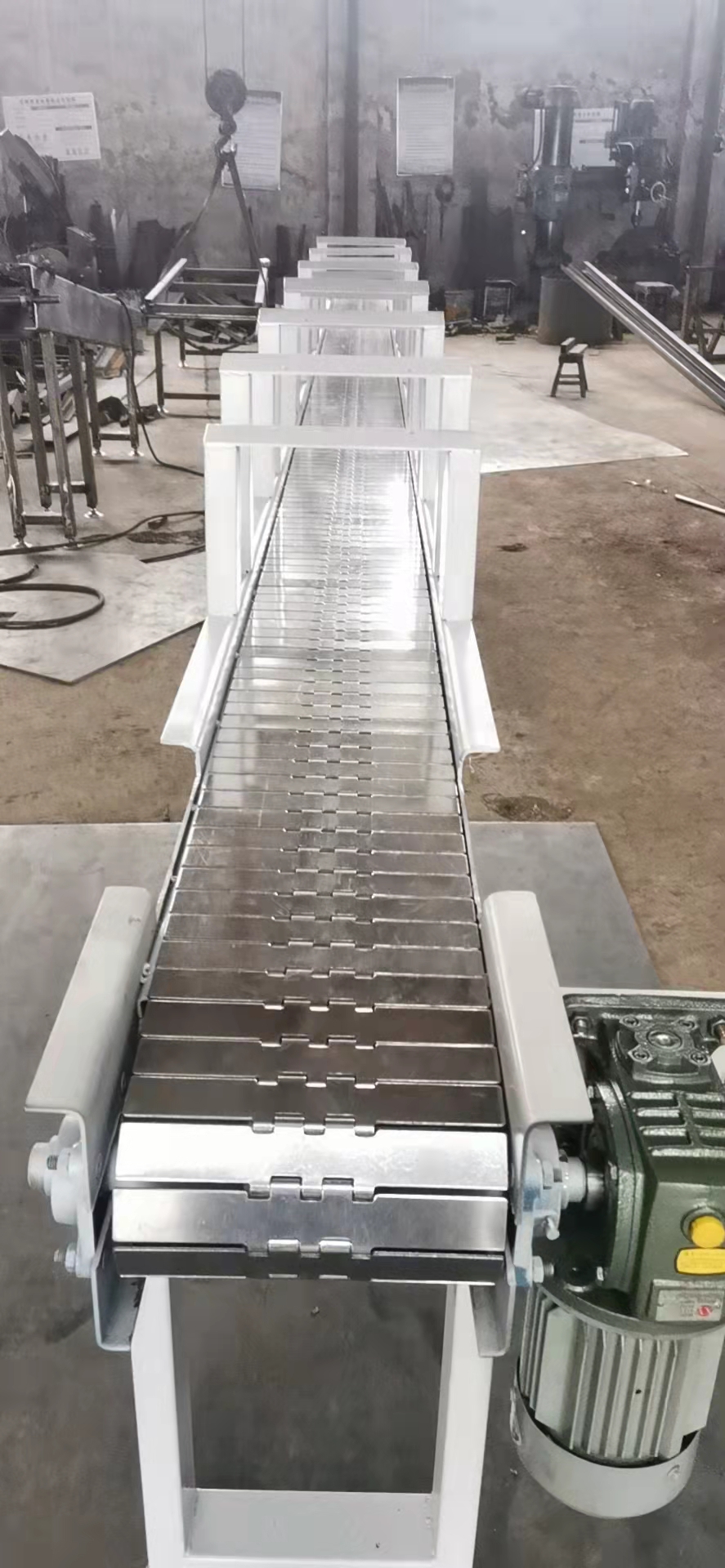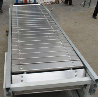 鏈板輸送機(jī):又叫鏈板傳送機(jī),鏈板線,鏈板傳送帶。是一種利用循環(huán)往復(fù)的鏈條作為牽引動力,以金屬板作為輸送承載體的一種輸送機(jī)械設(shè)備。國內(nèi)市場上有兩種鏈板輸送機(jī),一種是用鏈條,支軸和金屬板組成的輸送鏈板做成的輸送機(jī);一種是用帶彎板的鏈條和金屬板組成的金屬板輸送帶做成的鏈板輸送機(jī),另一種是平頂鏈鏈板輸送機(jī)。