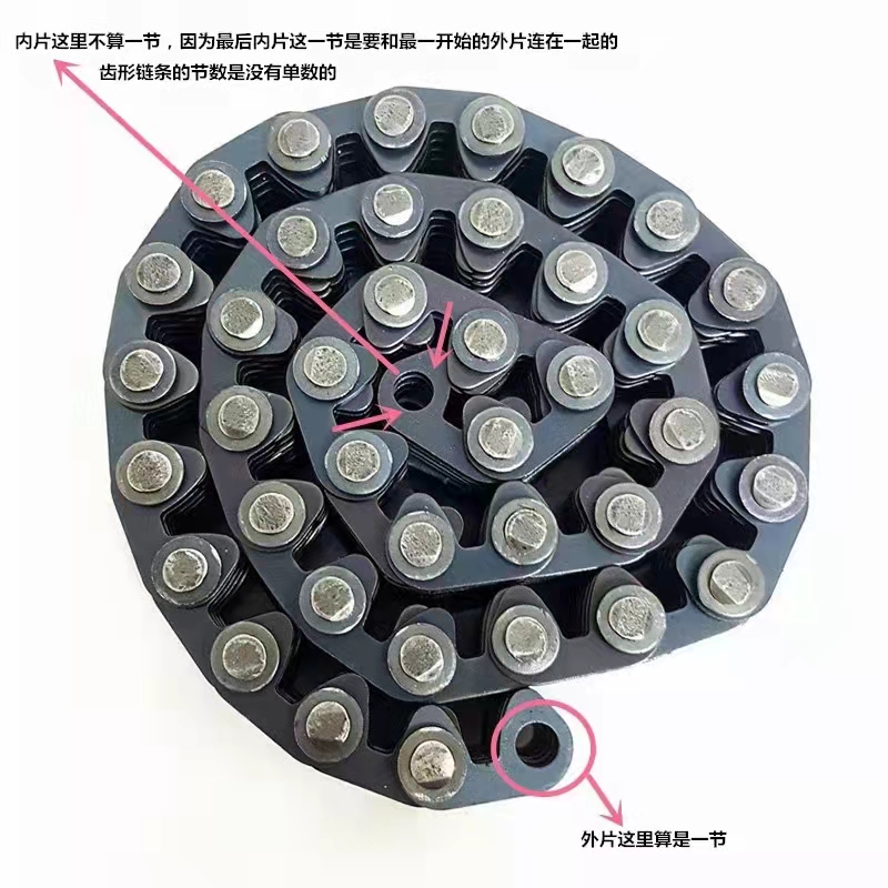 加鏈片排數(shù))。齒形鏈是一種應(yīng)用廣泛的重要機械基礎(chǔ)件,主要用在高速、重載、低噪音、大中心距的工況下,其傳動性能優(yōu)于齒形帶傳動、齒輪傳動以及滾子傳動,以成為眾多行業(yè)對傳動形式之一,以嚙合形式分可分為內(nèi)嚙合齒形鏈、外嚙合齒形鏈和內(nèi)外復(fù)合嚙合齒形鏈,其中內(nèi)外復(fù)合嚙合齒形鏈的噪音最小,應(yīng)用也最廣泛