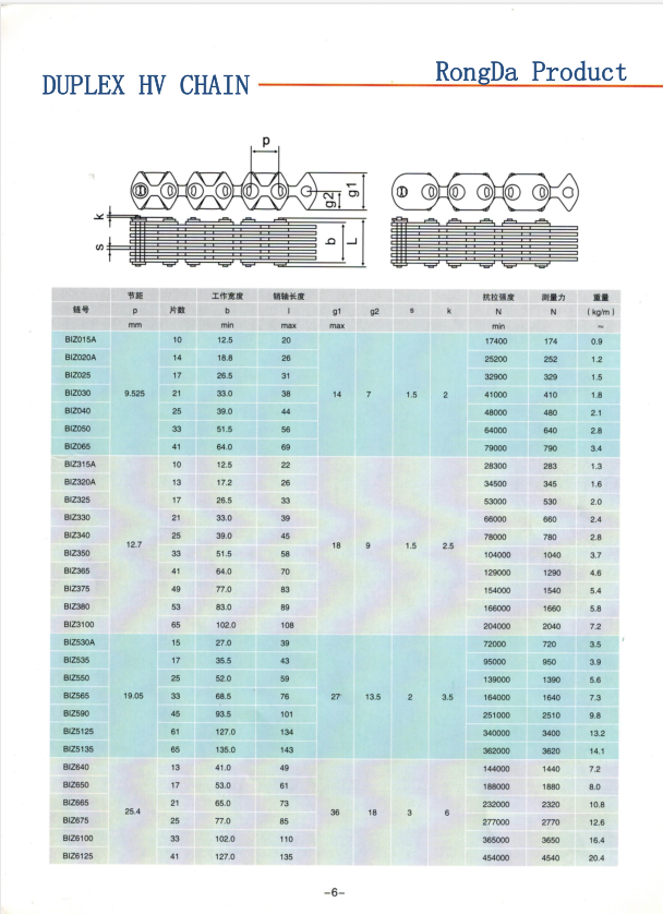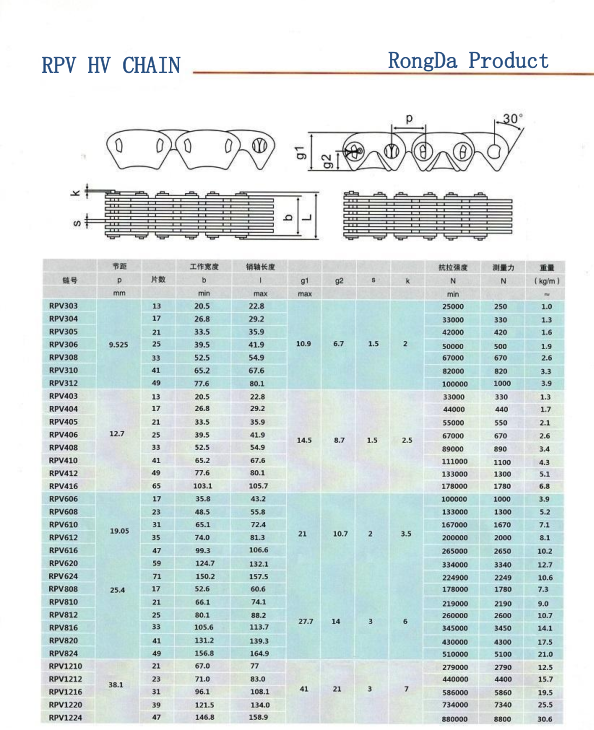 齒形鏈條簡(jiǎn)介:齒形鏈又稱(chēng)無(wú)聲鏈(Silent Chain),屬于傳動(dòng)鏈的一種形式。我國(guó)的國(guó)家標(biāo)準(zhǔn)為:GB/T10855-2003《齒形鏈和鏈輪》。齒形鏈?zhǔn)怯梢幌盗械凝X鏈板和導(dǎo)板交替裝配且銷(xiāo)軸或組合的鉸接元件連接組成,相鄰節(jié)距間為鉸連節(jié)。根據(jù)導(dǎo)向型式可分為:外導(dǎo)式齒形鏈、內(nèi)導(dǎo)式齒形鏈和雙內(nèi)導(dǎo)齒形鏈.齒形鏈又稱(chēng)無(wú)聲鏈,屬于傳動(dòng)鏈的一種形式。齒形鏈?zhǔn)且环N應(yīng)用廣泛的重要機(jī)械基礎(chǔ)件,主要用在高速、重載、低噪音、大中心距的工況下,其傳動(dòng)性能優(yōu)于齒形帶傳動(dòng)、齒輪傳動(dòng)以及磙子鏈傳動(dòng),以成為眾多行業(yè)對(duì)傳動(dòng)形式之一,以嚙合形式分可分為內(nèi)嚙合齒形鏈、外嚙合齒形鏈和內(nèi)外復(fù)合嚙合齒形鏈,其中內(nèi)外復(fù)合嚙合齒形鏈的噪音小,應(yīng)用也廣泛。
