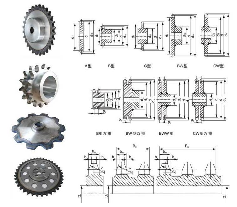 鏈輪軸面齒形兩側(cè)呈圓弧狀,以便于鏈節(jié)進入和退出嚙合。齒形用標準刀具加工時,在鏈輪工作圖上不必繪制端面齒形,但須繪出鏈輪軸面齒形,以便車削鏈輪毛壞。軸面齒形的具體尺寸見有關(guān)設計手冊。鏈輪齒應有足夠的接觸強度和耐磨性,故齒面多經(jīng)熱處理。小鏈輪的嚙合次數(shù)比大鏈輪多,所受沖擊力也大,故所用材料一般應優(yōu)于大鏈輪。常用的鏈輪材料有碳素鋼(如Q235、Q275、45、ZG310-570等)、灰鑄鐵(如HT200)等。重要的鏈輪可采用合金鋼。小直徑鏈輪可制成實心式;中等直徑的鏈輪可制成孔板式;直徑較大的鏈輪可設計成組合式,若輪齒因磨損而失效,可更換齒圈。
